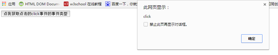 event的参数,包含着事件的基本信息。<body> <button id="btn">点我获取点击的click事件的事件类型</button> <script type="text/javascript"> var btn = document.getElementById("btn"); //当点击事件发生的时候,浏览器会把发生的这次点击封装成一个事件对象,通过时间处理程序的参数传进来。 //在处理程序内部就可以使用这个事件对象了。 btn.onclick = function (event) { alert(event.type); // click } </script> </body